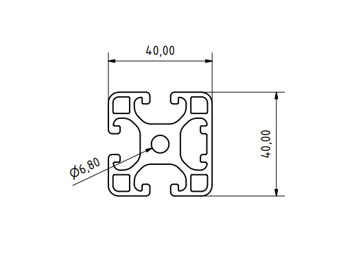 Odľahčený hliníkový profil s rozmerom 40 x 40 mm a jednou plnou stranou. Šírka drážky je 8 mm